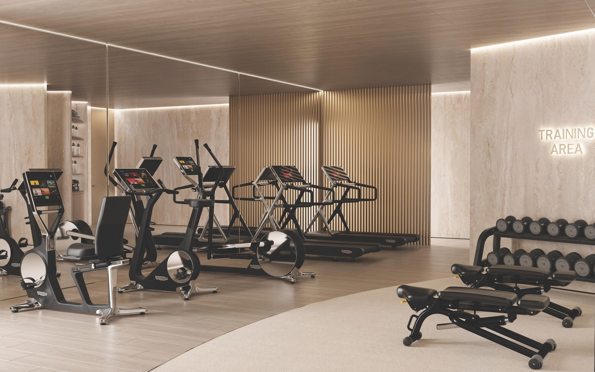 The fitness center is designed as a contemporary wellness space, where light, proportion, and materiality define the atmosphere. Large windows frame views of the surrounding landscape, creating a sense of openness and connection to the outdoors. Equipped with state-of-the-art technology and finished with tactile surfaces, it offers an environment conceived for balance, movement, and wellbeing.