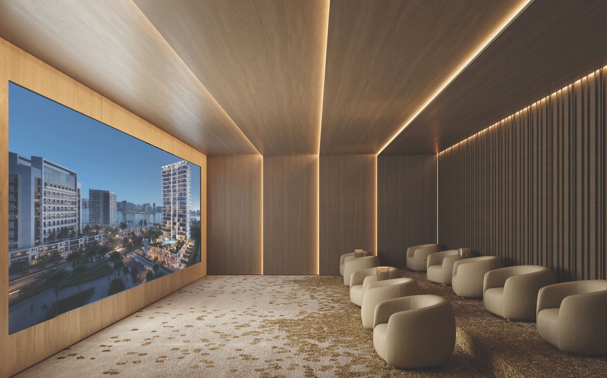 The cinema area offers a private setting dedicated to entertainment and relaxation. Designed with soft acoustics, plush seating, and subtle lighting, it combines comfort with an immersive atmosphere. The layout promotes an intimate viewing experience, creating a space where leisure is shaped through thoughtful design.