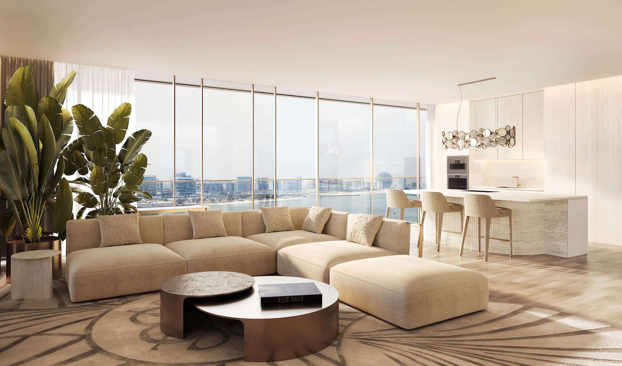 Perched above the island, the penthouses of STELLAR by ELIE SAAB open to sweeping views of Yas Island and the sea beyond. Expansive layouts and fluid geometries frame interiors bathed in natural light, defining a living experience of openness and grace. The living area is conceived as the heart of the home, framed by full-height glazing that draws the horizon indoors. Balanced proportions, sculptural forms, and refined finishes convey ELIE SAAB’s unmistakable aesthetic, creating an atmosphere that feels both grand and intimately connected to its surroundings.